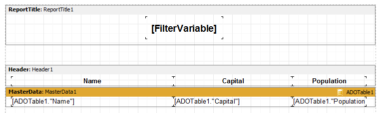 6. Поместим переменную в заголовок отчета. А на бэнд MasterData положим поля: Name, Capital и Population: