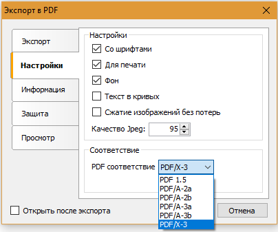Основные отличия в разделе «Соответствие». Теперь не нужно выбирать эту опцию. По умолчанию выбран формат PDF 1.5. Это обычный Экспорт в PDF. В список стандартов соответствия добавился еще один – PDF/X-3. Выбираем его. При этом опции из вкладки «Защита» будут недоступны.