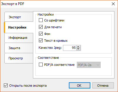 - Выбираем экспорт в формат PDF. Нас интересует вкладка «Настройки»: