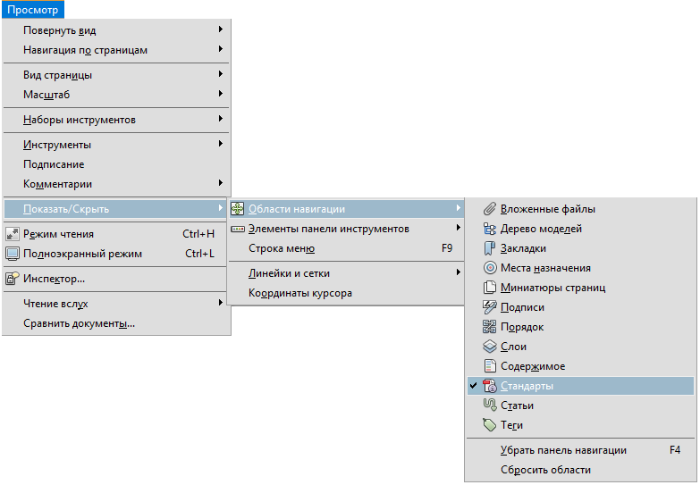 Открываем файл экспорта в PDF в программе Adobe Acrobat Pro. Для проверки соответствия документа стандарту необходимо открыть панель «Стандарты». Открываем меню «Просмотр»-«Показать/Скрыть»->«Область навигации»->«Стандарты».