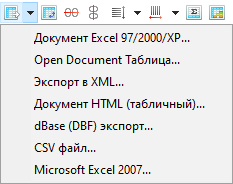 На данный момент поддерживается экспорт в 5 форматов: Excel, ODS, XML, HTML, DBF. Для выбора экспорта нажмите кнопку на панели инструментов:
