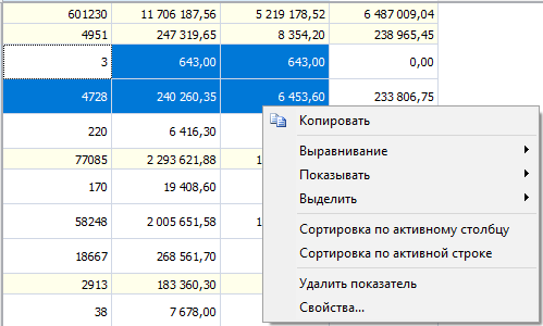 Кроме возможности экспорта, также существует возможность скопировать часть данных кросс-таблицы в буфер обмена. Для выполнения этой операции следует выделить требуемую область в кросс-таблице при помощи мыши или клавиатуры (удерживая Shift и перемещая курсор), а затем произвести копирование выделенных данных в буфер обмена нажав на клавиатуре комбинацию клавиш "Ctrl + C" или "Ctrl + Insert", или при помощи выпадающего меню.