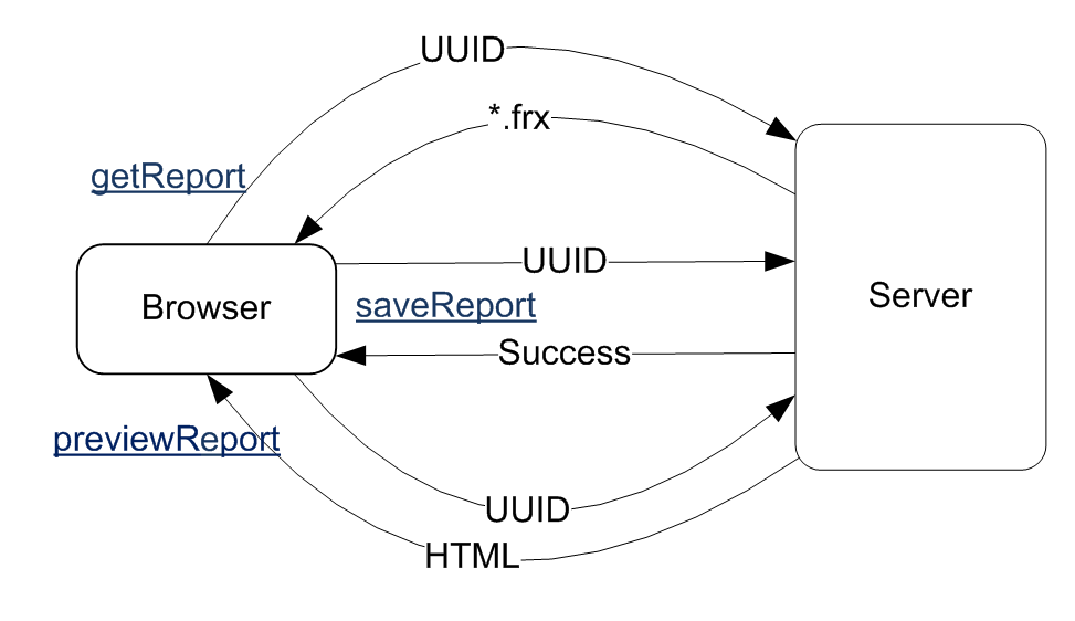 Таким образом, FastRport Online Designer позиционируется как редактор .Net отчетов, которые уже были созданы и размещены по какому-либо UUID на сервере. Онлайн дизайнер «общается» с сервером через оговоренный заранее API, в который входит 3 запроса: